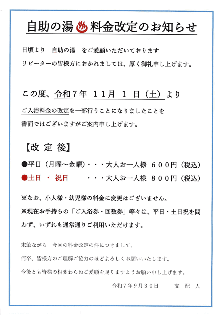 自助の湯の料金改定のお知らせ